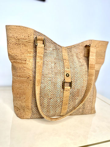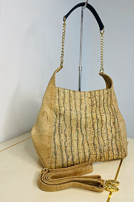Borsa beige con inserto decorativo grigio, manici e tracolla, tasca interna con zip, porta cellulare