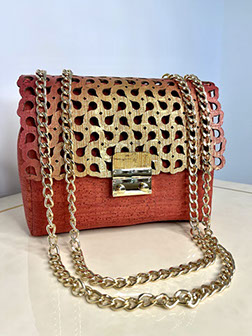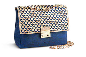 Borsa con catenella dorata e manico blu, una tasca esterna con zip, tasca grande (separatore) con zip più due tasche più piccole di cui una