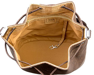 Borsa a secchiello con tracolla. Colore marrone. Tasca interna con chiusura zip e gancio di sicurezza per chiavi o altro.