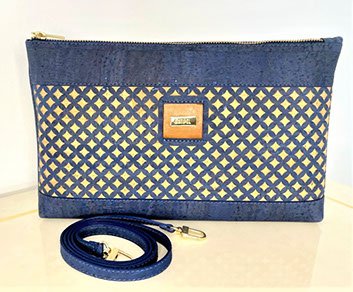 Pochette strutturata blu/beige, chiusura con zip, tracolla fine.